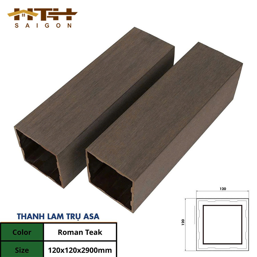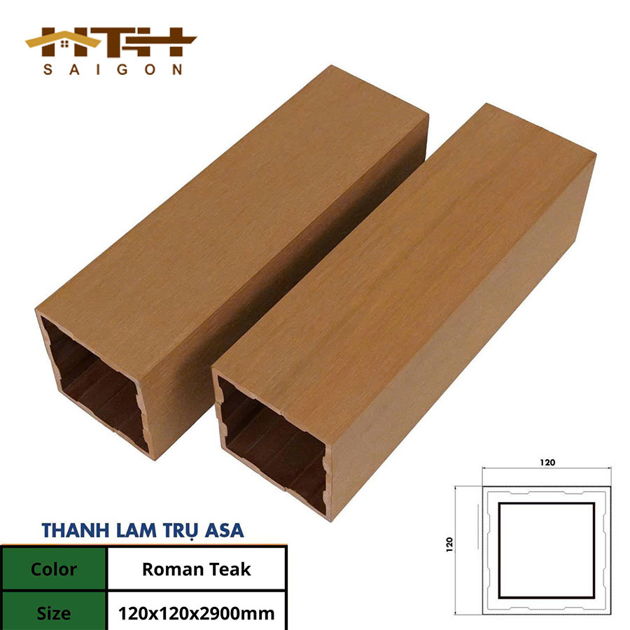 Lam trụ gỗ nhựa kích thước 120x120x2900mm ASA ngoài trời là loại thanh lam trụ (cột trụ) làm từ gỗ nhựa phủ lớp ASA, chuyên dùng cho không gian ngoại thất. Sản phẩm này kết hợp bột gỗ, nhựa HDPE/PVC và phụ gia, với lớp phủ ASA (Acrylonitrile Styrene Acrylate) giúp tăng khả năng chống chịu thời tiết khắc nghiệt.